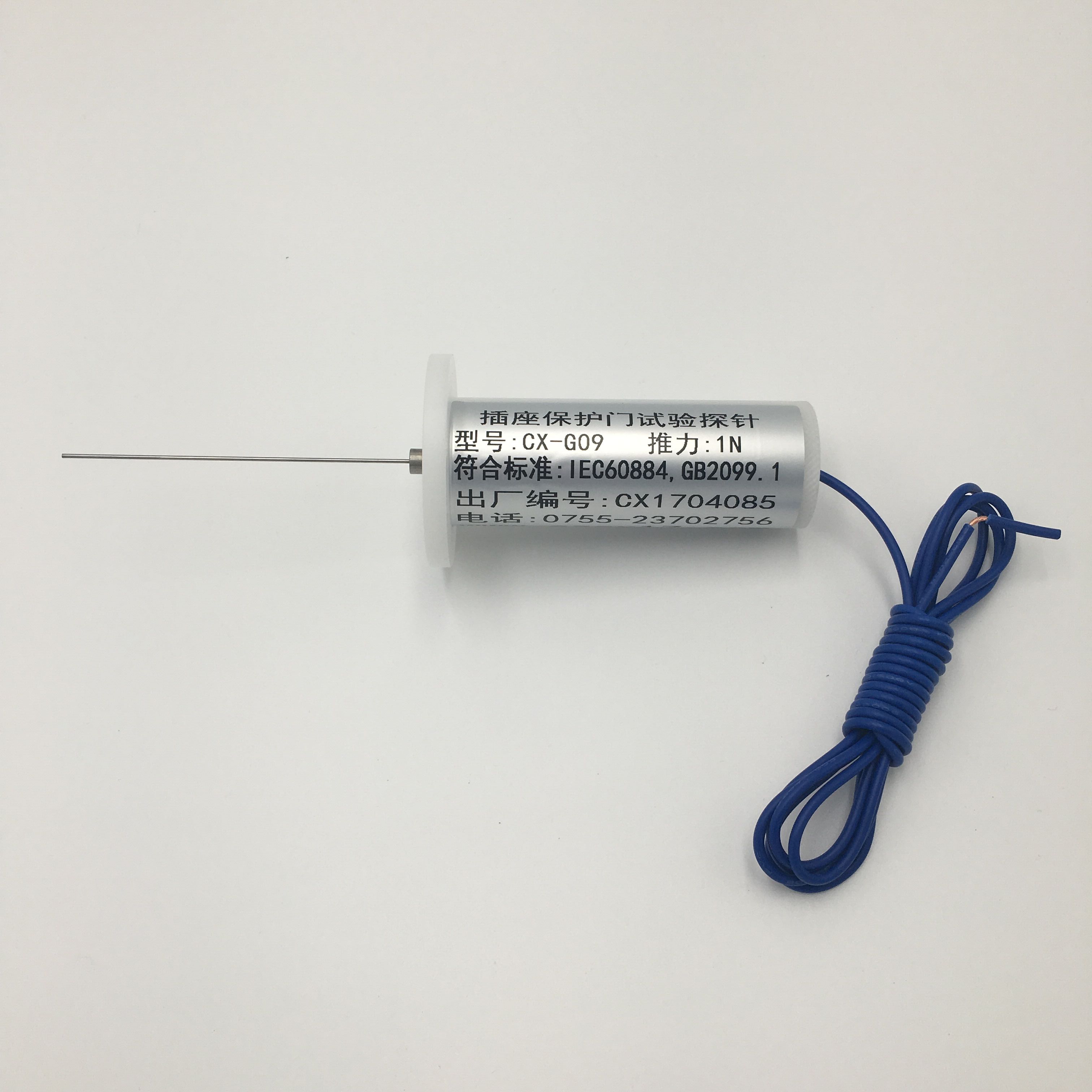 符合標(biāo)準(zhǔn)及條款GB/T2099.1-2021《家用和類似用途插頭插座 第1部分:通用要求》圖9和圖10試樣及限制:插座試驗(yàn)用途:a) 用于檢查保護(hù)門內(nèi)帶電部件的不可觸及性;b) 用于檢查保護(hù)門內(nèi)帶電部件及有加強(qiáng)保護(hù)插座的帶電部件的不可觸及性測試原理:以標(biāo)準(zhǔn)圖的探棒尺寸及長度作為區(qū)分電器外殼不同防護(hù)等級的標(biāo)準(zhǔn),以對探棒施加電流或者力值后,探棒是否可接觸樣品判斷試樣合格與否設(shè)備結(jié)構(gòu):尼龍手柄+鋼制探棒。配接線端子做防觸電試驗(yàn),自帶推力名稱型號:20N插座保護(hù)門探針描述:GB2099-2008圖9、IEC60884:2006圖9,3×1×80,用于檢查保護(hù)門內(nèi)帶電部件的不可觸及性 施加力/ N:20